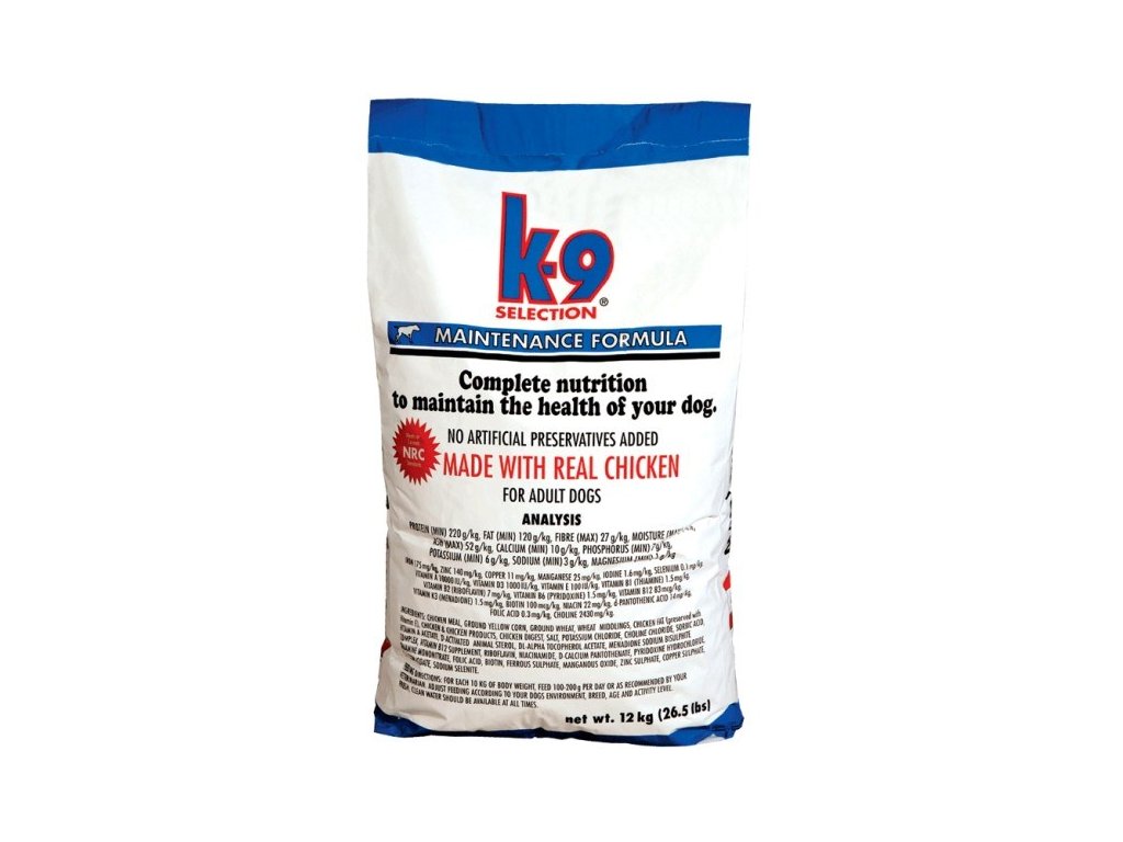 K-9 Selection MAINTENANCE poskytuje dospělému psovi s běžnou aktivitou všechno nezbytné k dosažení kvalitního života. Je vhodným celoživotním krmivem pro psy, kteří už ukončili fázi růstu. Mnoha generacemi psů prověřené krmivo vyrobené z kuřat je velmi lehce stravitelné, udržuje dobré zdraví, tělesnou kondici a kvalitní srst.