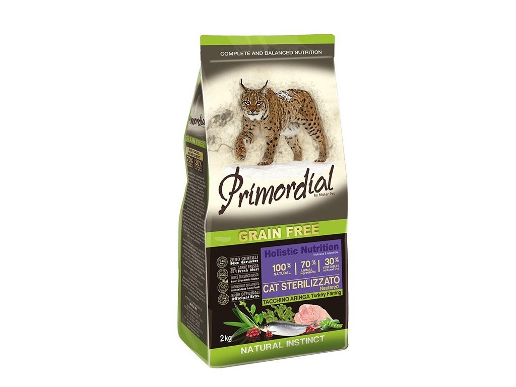 Primordial Grain-Free Neutered Cat Turkey and Herring je kompletní vysoce stravitelné bezobilné krmivo bohaté na bílkoviny vysoké biologické hodnoty a obsahuje vhodnou kompozici aminokyselin. Krůtí maso, striktně z volného výběhu, je velmi chutné a obsahuje pro kočky jednoduše stravitelné bílkoviny. Sleď poskytne kompletní bílkoviny a je bohatým zdrojem omega 3 mastných kyselin, které vykonávají důležitou kosmetickou funkci pro kůži a srst a jsou velmi prospěšné pro kardiovaskulární systém (srdce a cévy). Ovoce a zelenina bohaté na vitaminy, minerály a fytonutrienty, lespedézie s blahodárnými účinky na močové cesty a brusinky s antioxidační funkcí dodávají tomuto krmivu dokonalou rovnováhu chuti a živin. Jedná se o skutečně holistický produkt, který aktivně přispívá k celkovému zdraví kočky.