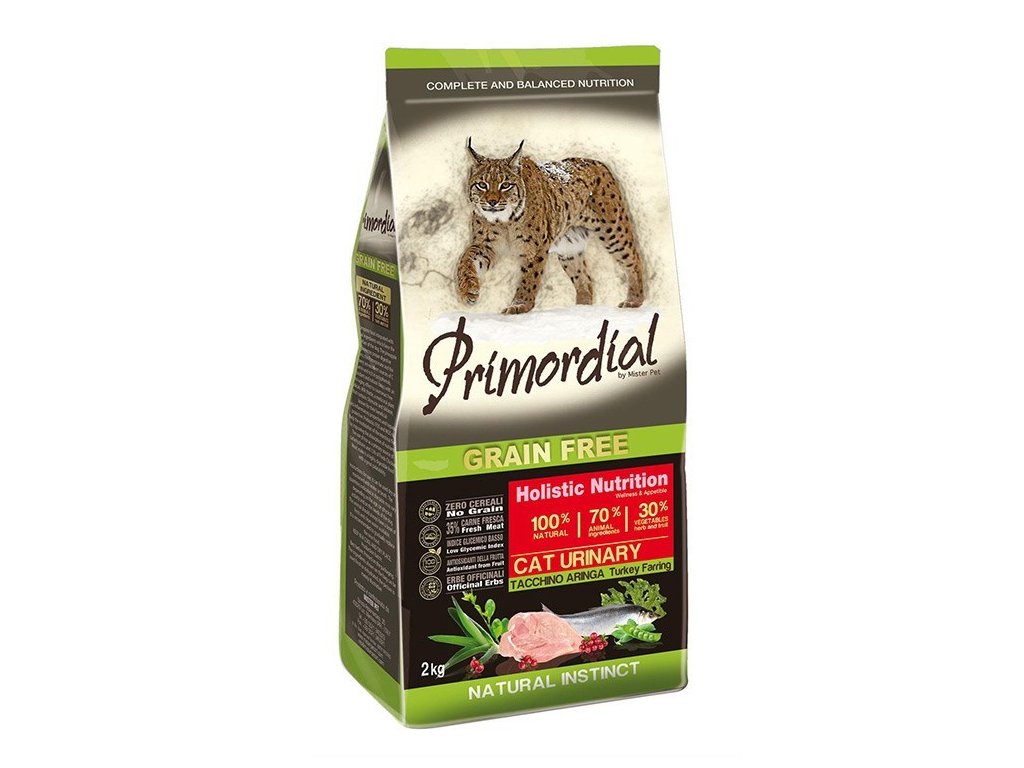 Primordial Grain-Free Urinary Turkey and Herring je kompletní vysoce stravitelné bezobilné krmivo bohaté na bílkoviny a esenciální aminokyseliny vysoké biologické hodnoty z masa. Množství zeleninové bílkoviny bylo sníženo, protože může postupem času vést k ledvinovým problémům. Krůtí maso, striktně z volného výběhu, je velmi chutné a obsahuje jednoduše stravitelné bílkoviny. Sleď poskytne kompletní bílkoviny a je bohatým zdrojem omega 3 mastných kyselin, které vykonávají důležitou kosmetickou funkci pro kůži a srst a jsou velmi prospěšné pro kardiovaskulární systém (srdce a cévy). Ovoce a zelenina bohaté na vitaminy, minerály a fytonutrienty, lespedézie s blahodárnými účinky na močové cesty, brusinky s antioxidační funkcí a nízký obsah některých minerálů, které mohou vést k tvorbě ledvinových kamenů, dodávají tomuto krmivu dokonalou rovnováhu chuti a živin. Jedná se o skutečně holistický produkt, který redukuje riziko ledvinových problémů.
