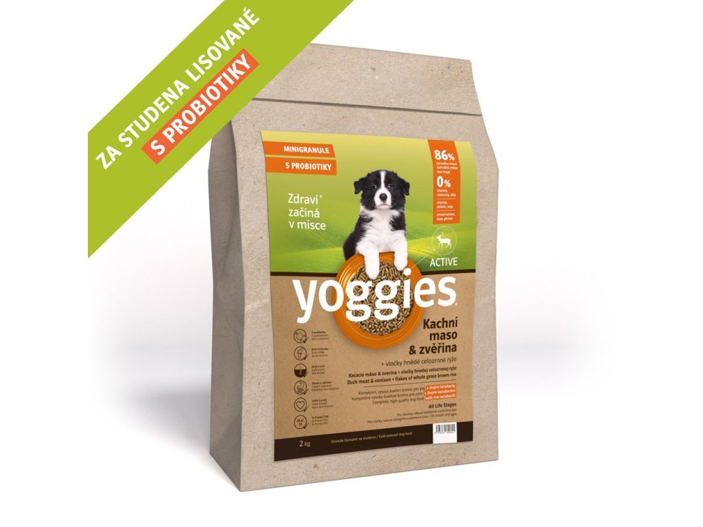 Yoggies Active doporučujeme jako první volbu při hledání vhodných a zdravých granulí pro štěňata všech plemen. Důvodem je fakt, že tyto za studena lisované granule obsahují 28,6% proteinů a 12% tuku získaných primárně z přírodních zdrojů bez jakékoliv chemie, obilí a sóji jen z kvalitního masa a surovin (obsah syrového masa v granulích Yoggies Active před pomalým sušením je ca 86%). Nepřidává se žádný přídatný tuk, konzervanty ani aditiva a granule neobsahují žádnou masokostní moučku, lepek, sóju ani geneticky upravené suroviny apod. I zde jsou suroviny mlety „nahrubo“ proto, aby podporovaly peristaltiku žaludku a střev i skvělé trávení a vstřebávání potravy. Granule nebobtnají, ale rozpouští se, čímž se potlačuje riziko torze žaludku.