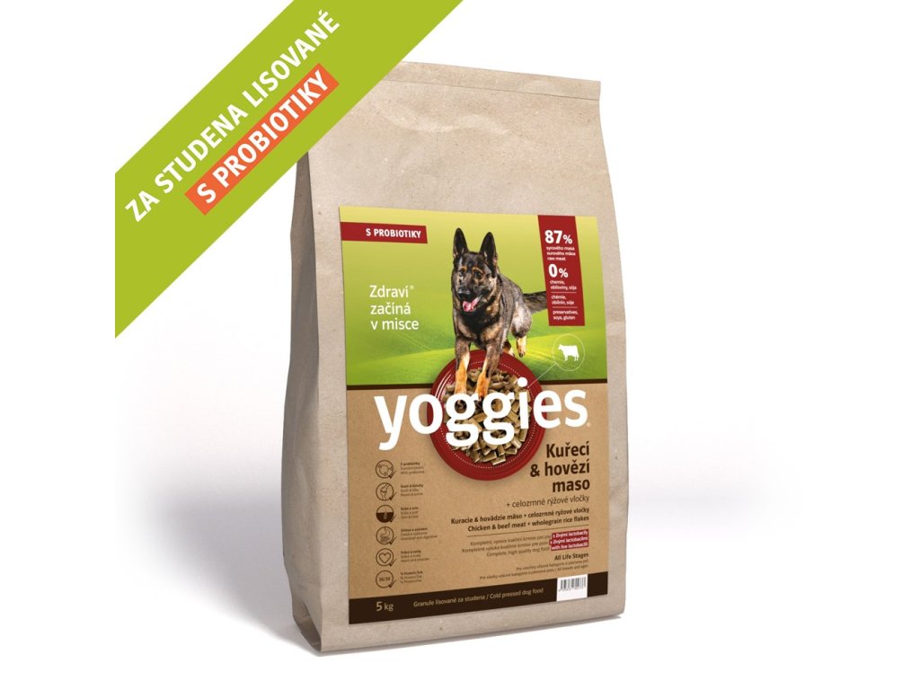 Granule bez lepku, sóji a chemie, plné přírodních vitamínů, bylinek a vyváženého obsahu kuřecího i hovězího masa. Yoggies granule lisované za studena pejskům skvěle chutnají a jsou mimořádně zdravé pro jejich trávicí systém. Jsou vyráběny pouze z kvalitních surovin, které se jen suší, melou a lisují. Obsahují 87% kvalitního syrového masa (před sušením) a díky tomu jsou špičkou na trhu. Laktobacily podporují imunitu i zdravý trávicí trakt, který také granule prebioticky čistí od usazenin. Jsou výborně stravitelné a nenabobtnají. Tím jsou pro psa snazší k trávení.